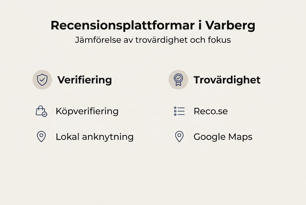 Reco.se är ledande för Varberg med verifierade lokalrecensioner, följt av Google Maps. Reco kräver köpverifiering vilket ger högre trovärdighet.