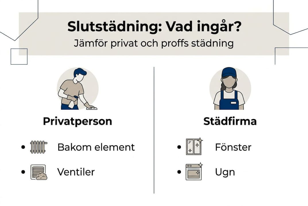 En professionell slutstädning följer en strikt och detaljerad checklista. Standardmoment inkluderar rengöring av alla ytor: fönster in- och utvändigt, element bakom, ugn, kyl och frys (avfrostad), toalett, golvbrunnar, skåp in- och utvändigt, lister, dörrar, ventiler och eluttag. Det är en lång lista, och det är lätt att missa delar av den.